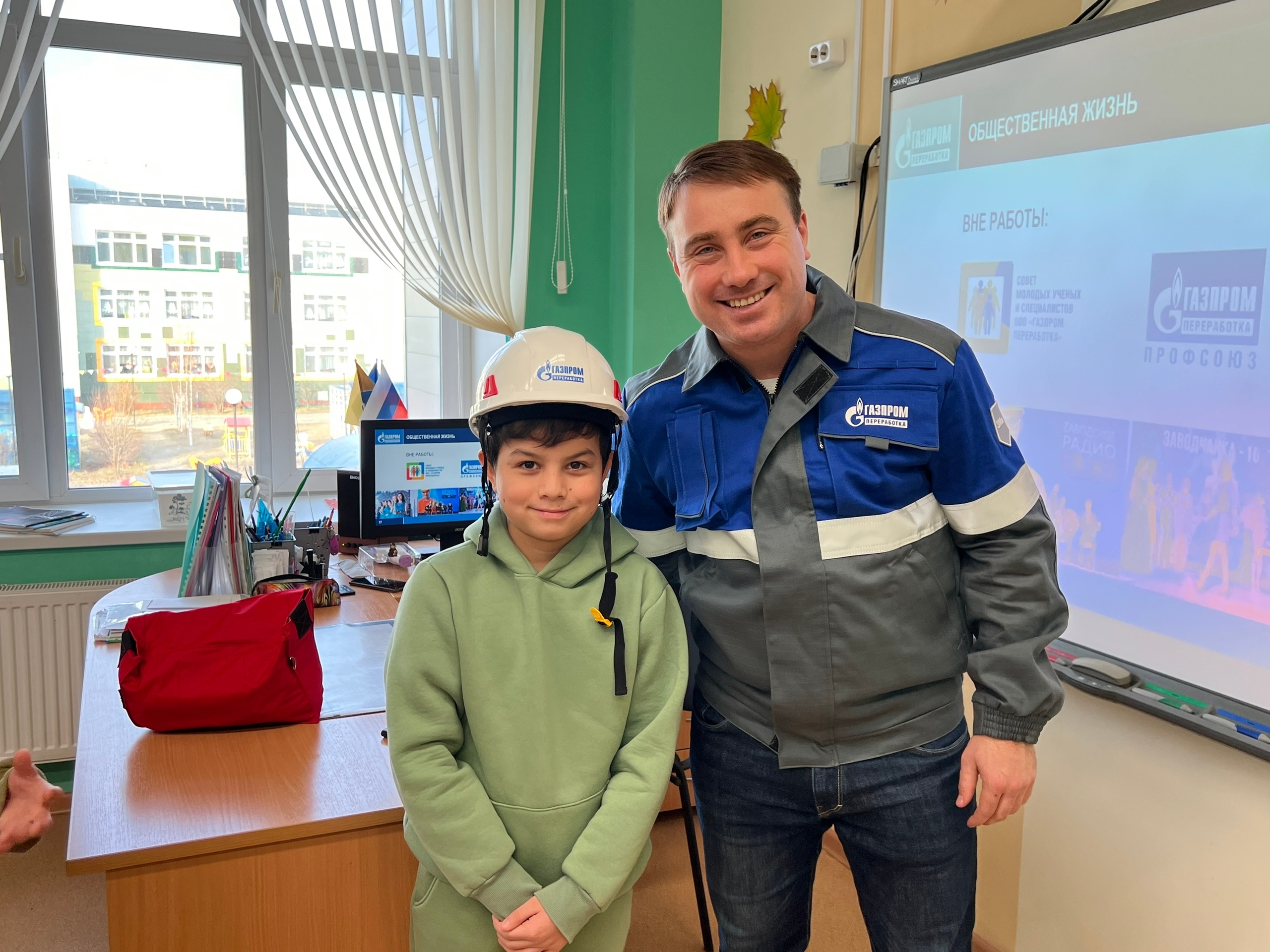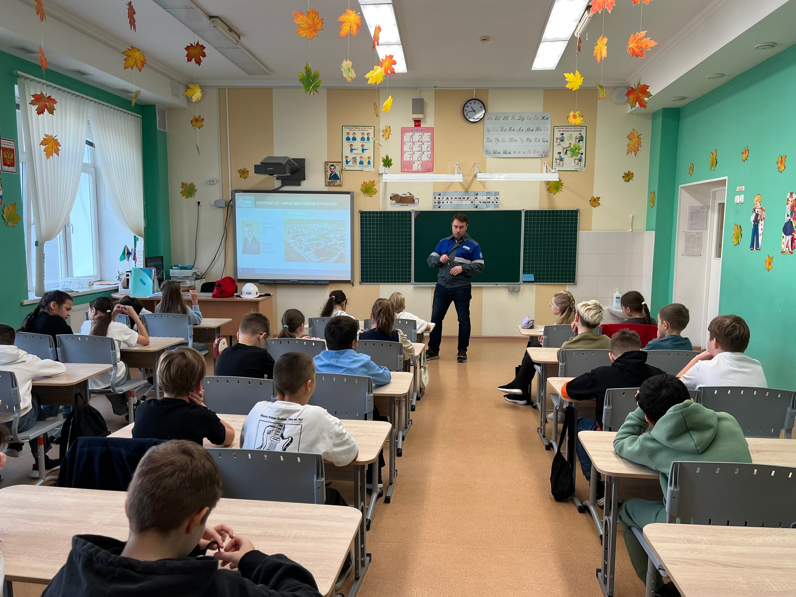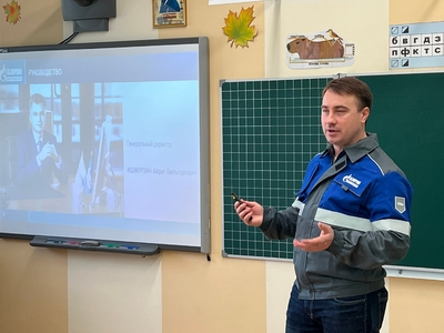 Ведущий технолог производства первичных процессов Михаил Важенин провел два урока — в четвертом и восьмом классах. Он рассказал ребятам о масштабах и задачах завода, а также о ключевых профессиях нефтегазового комплекса.